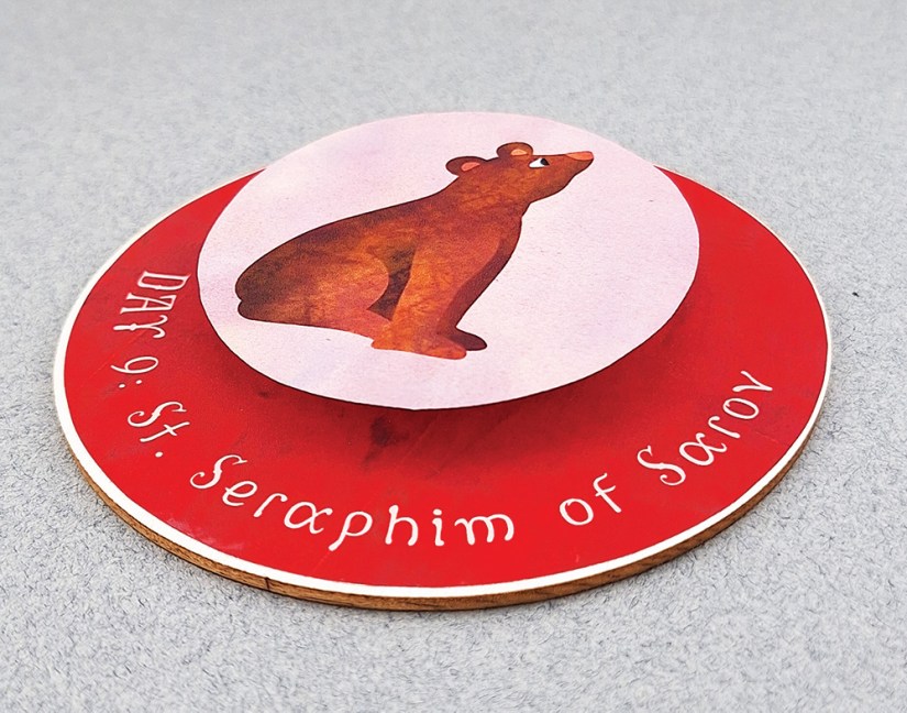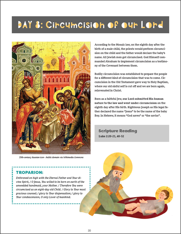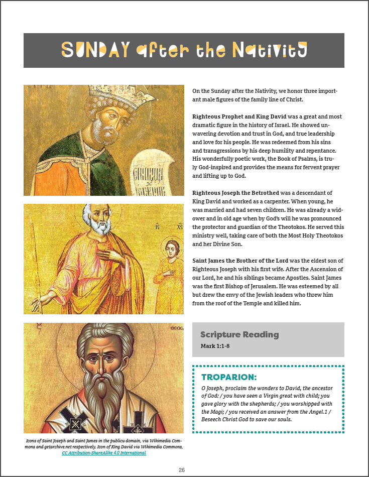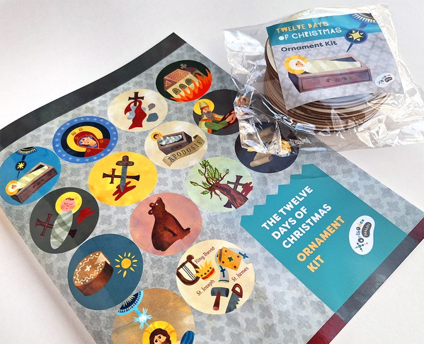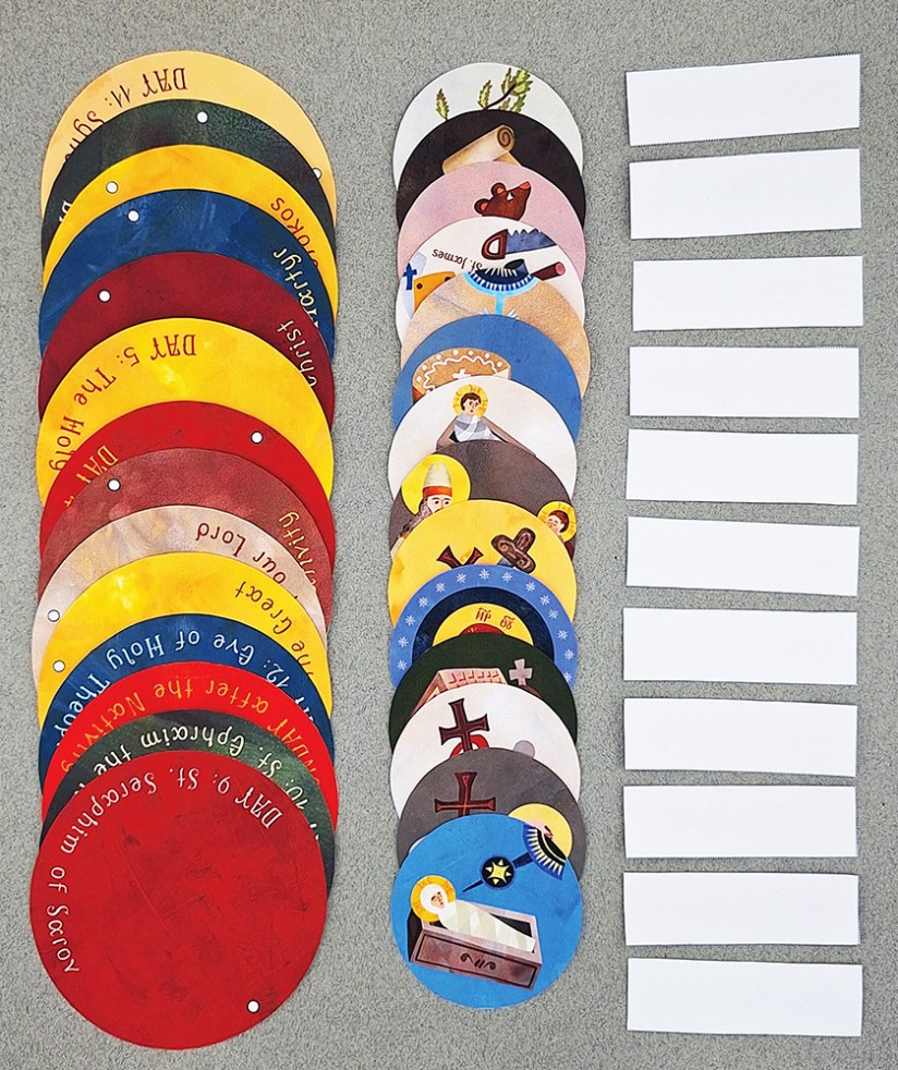 The Twelve Days of Christmas ornament kit consists of a book and wooden discs for making fourteen Orthodox-focused Christmas tree ornaments, celebrating the twelve-day period between the Nativity of Christ and Holy Theophany. The book contains the following: