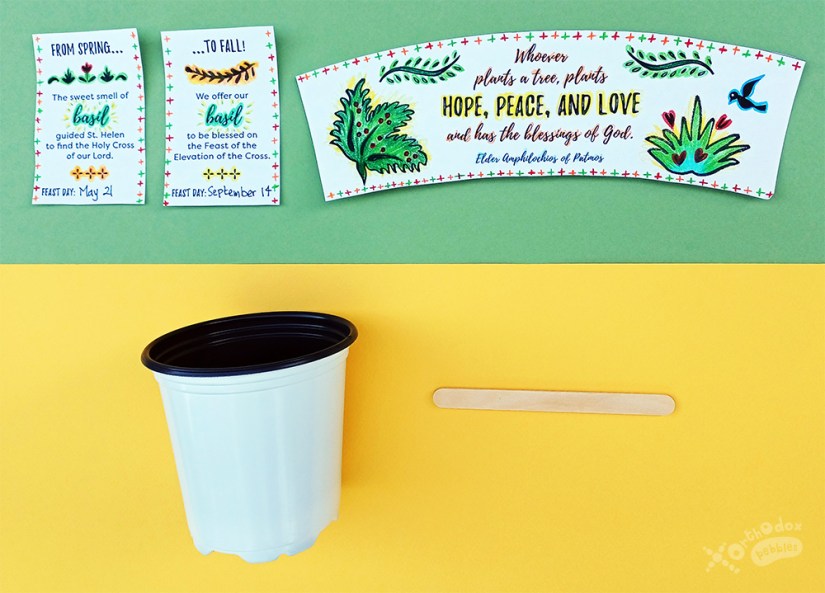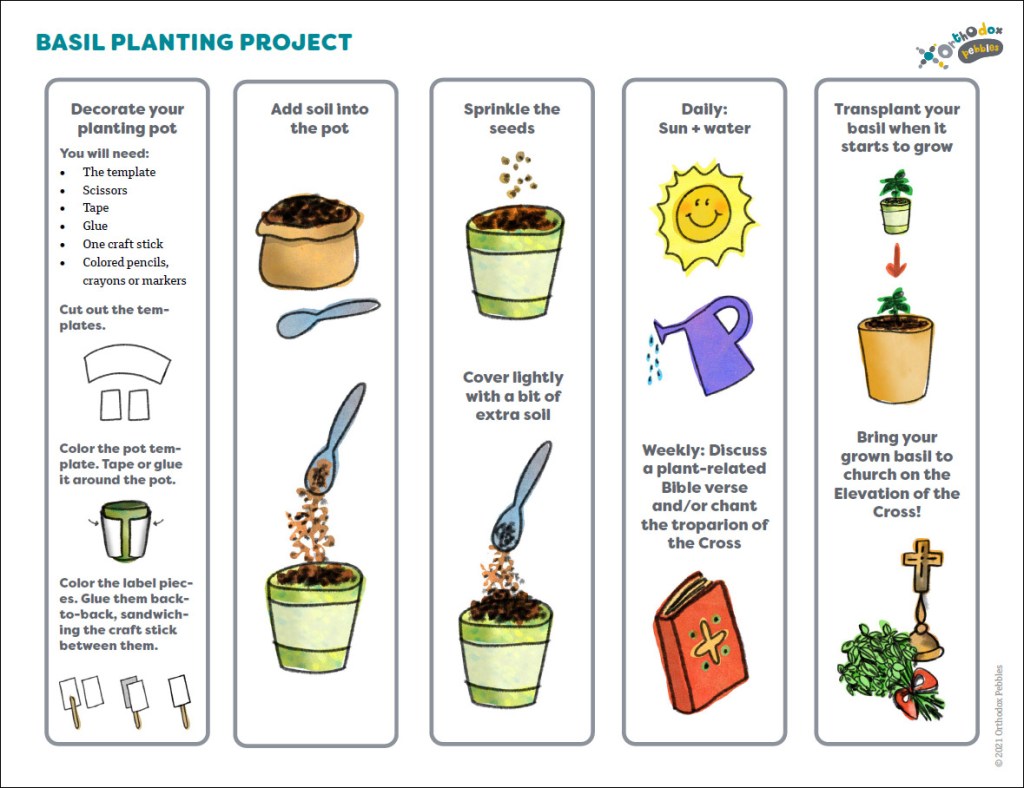 This year we ended our Sunday School season with a planting activity: the children planted basil seeds to grow over the summer, planning to bring their grown plants to church in September, to be blessed on the Feast of the Elevation of the Cross. It was a cool project that our director suggested, taking the group from the spring (Feast of St. Helen on May 21) to the fall (the Elevation of the Cross on September 14), and inspired by a longtime Orthodox tradition of growing a basil plant to offer on the Feast of the Cross.