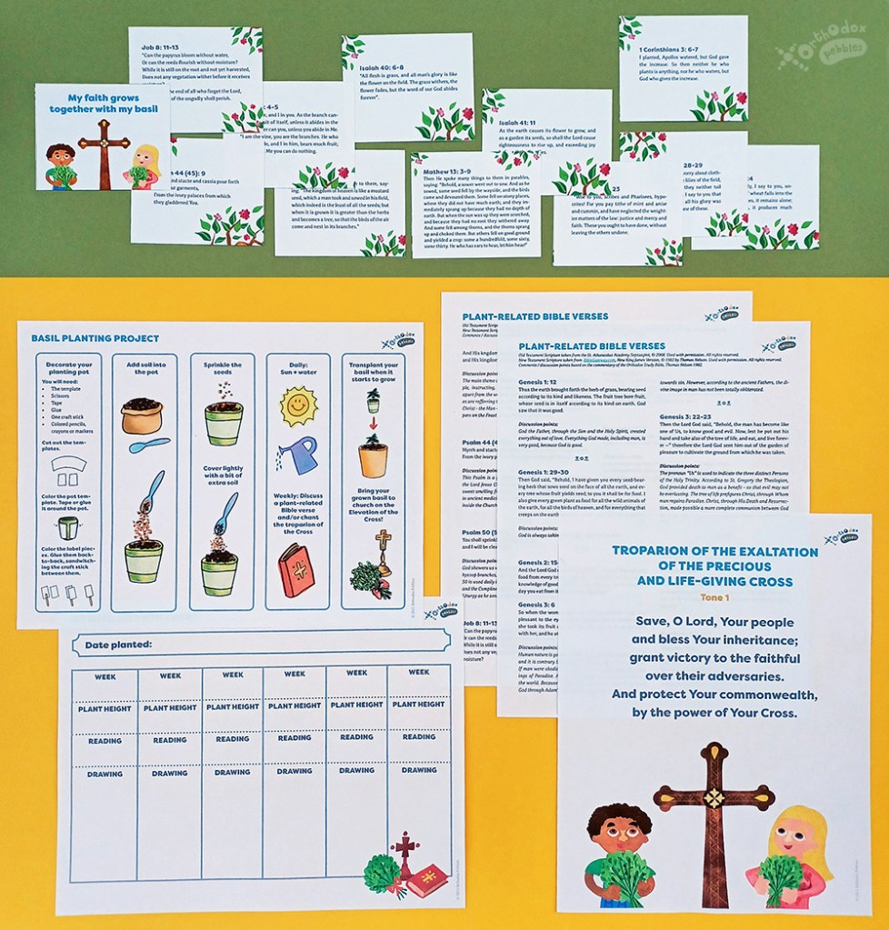 - Use a binder with loose-leaf paper to record each week’s reading: Onto a blank page, glue the Scripture card that was explored, then accompany it with your own comments, thoughts, pictures and related findings. The additional printed material for the planting project (visual guide, logs, troparion) can be stored in the binder as well.