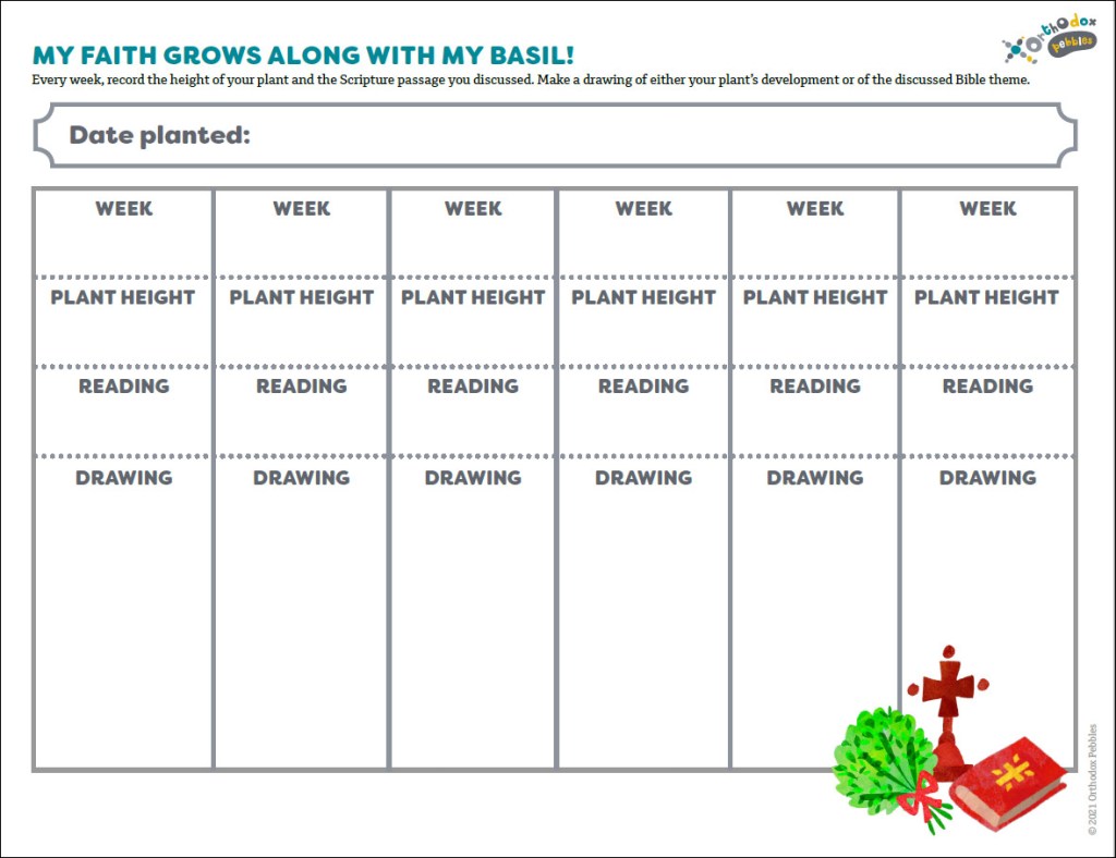 We created a log for recording the basil plant’s growth weekly. We included a space for also recording the explored Scripture reading. The child can additionally draw a picture – of either the plant or the discussed theme.