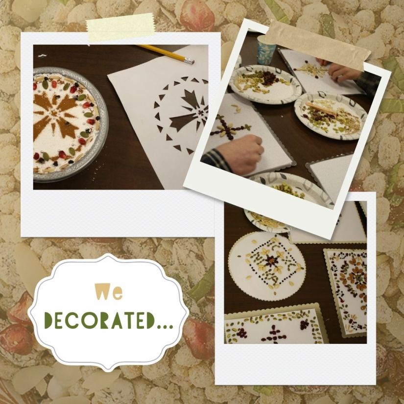 Then came the creative work! We practiced decorating with nuts and fruit, experimented with design layouts, and learned how to prepare and use stencils for delicate cinnamon patterns.