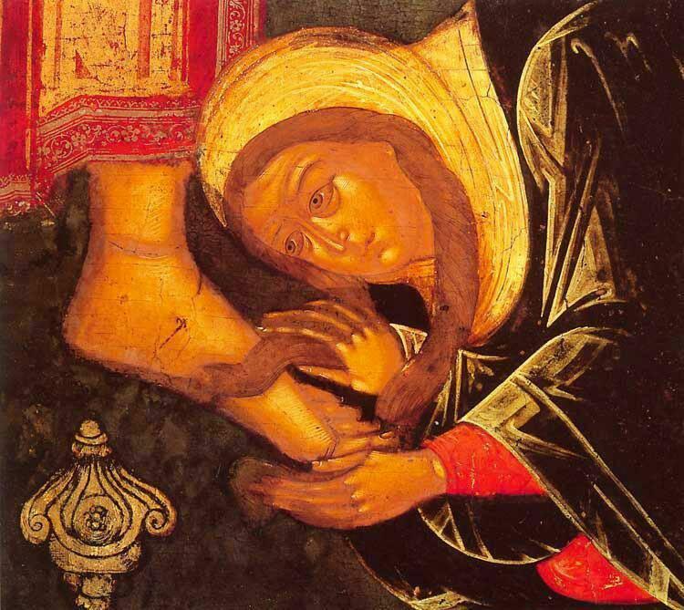 “The woman who had fallen into many sins, perceiving Thy divinity, O Lord, fulfilled the part of a myrrh-bearer; and with lamentations she brought sweet-smelling oil of myrrh to Thee before Thy burial. “Woe is me”, she said, “for night surrounds me, dark and moonless, and stings my lustful passion with the love of sin. Accept the fountain of my tears, O Thou who drawest down from the clouds the waters of the sea. Incline to the groanings of my heart, O Thou who in Thine ineffable self-emptying hast bowed down the heavens. I shall kiss Thy most pure feet and wipe them with the hairs of my head, those feet whose sound Eve heard at dusk in Paradise, and hid herself for fear. Who can search out the multitude of my sins and the abyss of Thy judgements, O savior of my soul? Despise me not, Thine handmaiden, for Thou hast mercy without measure.” (Hymn of Kassiani – Plagal of tone 4, Orthros of Holy Wednesday, celebrated on Holy Tuesday evening –listen HERE)
