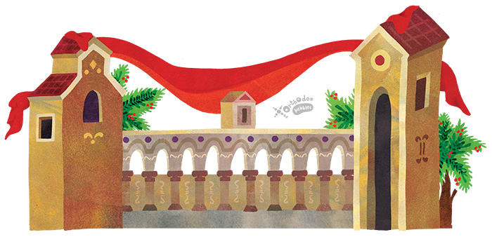 In the background there are light-colored buildings connected with a red canopy to signify that the event is taking place indoors. In some icons we see other objects-symbols to signify that the Theotokos is the one chosen to fulfill the Old Testament prophecies: a fountain with clear water (the Life-giving spring); a vase with white flowers (virginity); a small olive tree (peace, blessing, meekness); a reading table with an open Scripture Book (Old Testament).