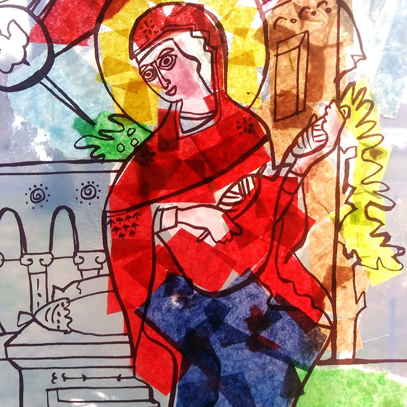 - Explain the icon. The paper puppets can be useful again, as they include all the details we want the children to observe in the icon.