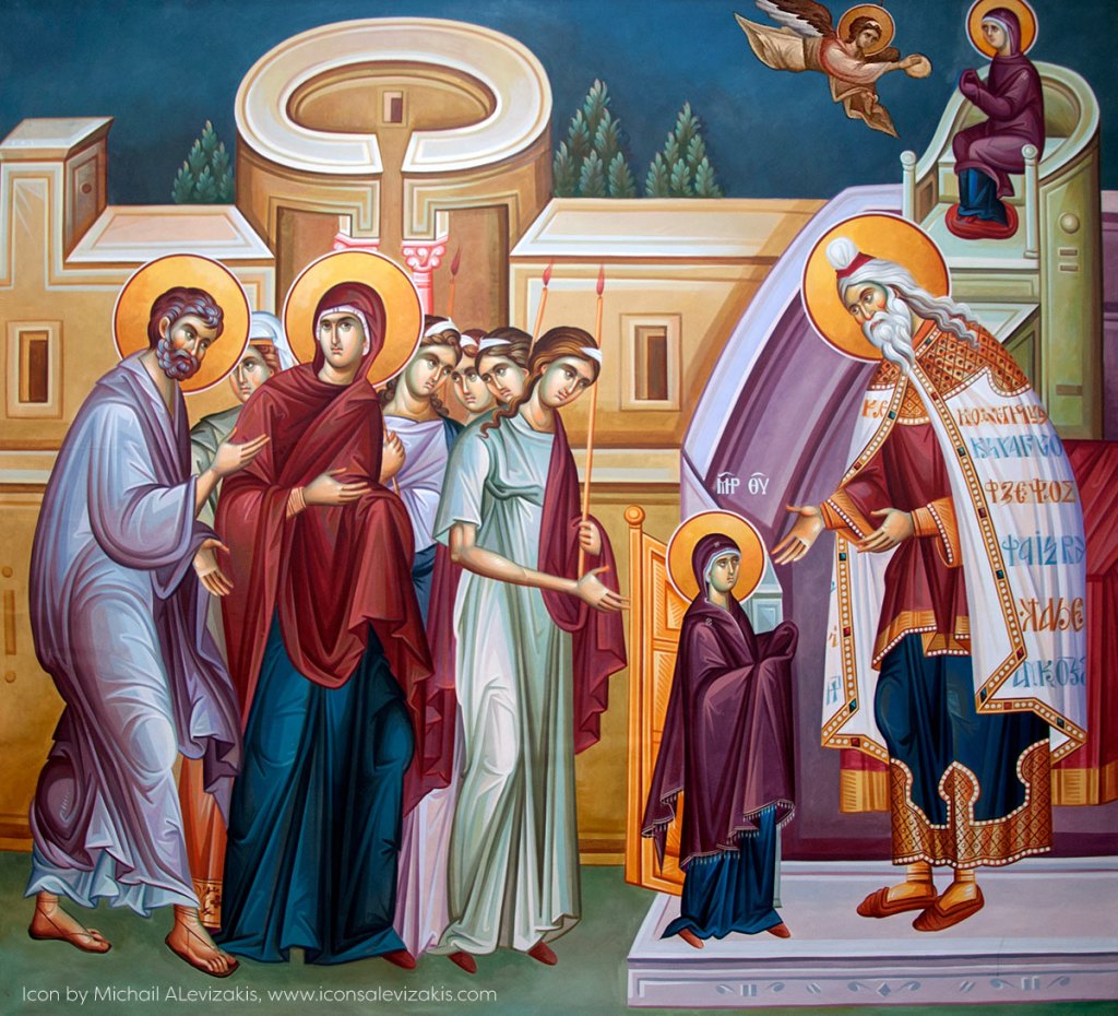 Fr. Lawrence Farley of OCA, offers the words of Fr. Constantine Callinicos, author of Our Lady the Theotokos, to help us navigate these sources: โIf the reader asks if he is to accept these narratives according to their letter or according to their spiritual depth, we must answer: according to their spiritual essenceโ, which means not being too concerned about the, sometimes, seeming discrepancies and/or errors. For the feast of the Entrance, this essence is, according to Fr. Farley, that “the young girl who once entered the Temple was destined to become the Temple of God. […] Maryโs first entrance into the Temple as a little child, though unremarkable and unnoticed historically at the time, was a prophetic snapshot, a revelation of the Templeโs eschatological purpose”.