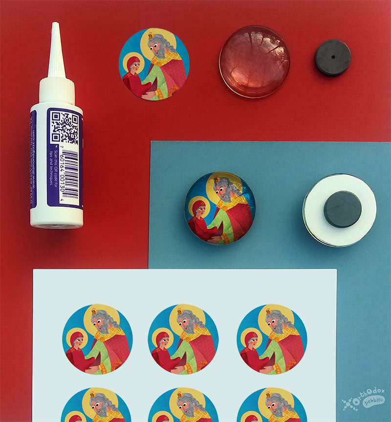 We had introduced this craft in our previous post about the Theotokos feast of the Annunciation. Presently, we are including a similar template of the Entrance, so you can, once again, make a glass magnet for the feast. We plan on making similar images for the rest of the Theotokos feasts when we get to work on them. That way, one could gradually build a collection of Theotokos feast magnets.