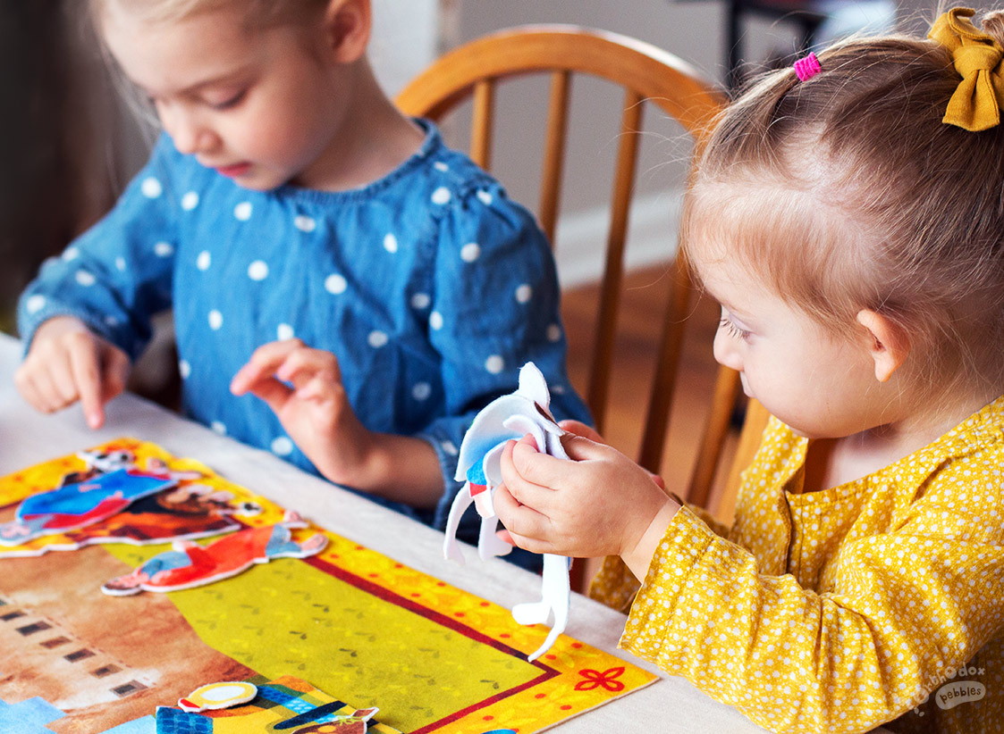 In 2024, we were able to change the material of these sets to better match our original idea, which was to create a teaching resource similar to the felt sets of our youth. The fabric sets are now made out of FELT instead of fleece. This has some advantages, but may also need some modifications in the way the set is prepared and used. Felt is stiffer, which allows for sturdier pieces and easier cutting. On the downside, felt is a little less sticky. For details on how to prepare and use your felt set, kindly visit the DIY tutorial page.